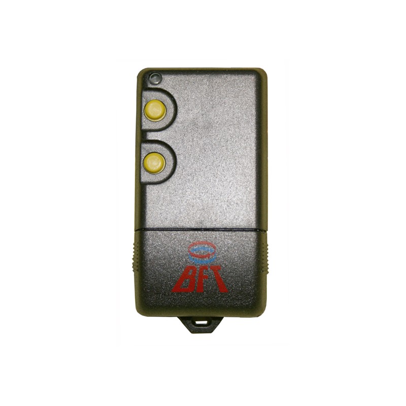 Mando de garaje BFT, modelo TEO 2 de 2 botones color amarillo o naranja. La frecuencia de este mando es de 433,92 MHz y la codificación se realiza por sistema de 10 switch.