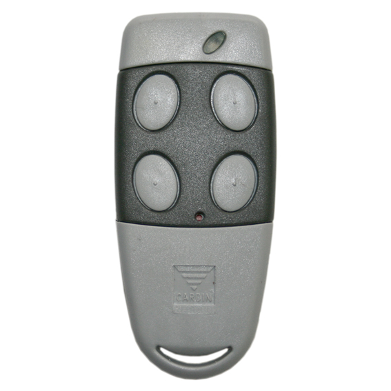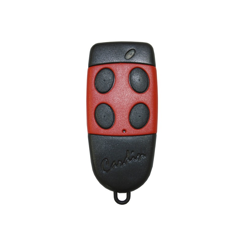 Mando de garaje marca CARDIN, modelo S486 QZ4 rojo de 4 botones color negro. La frecuencia de este mando a distancia es de 868.3 MHz y la codificación se realiza por sistema de grabación en el receptor.