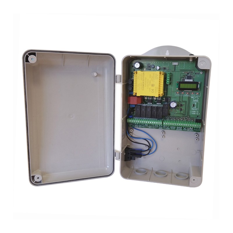 Cuadro de control modelo CLAS16 de la marca CLEMSA. Alimentado a 230V con LCD. Para 1 motor de puerta BATIENTE.
