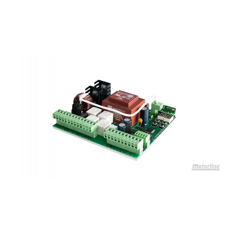 Cuadro de control modelo MC52P de la marca MOTORLINE. Alimentado a 230V. Para 2 motores de puertas BATIENTES con receptor de frecuencia 433.92 MHz EVOLUTIVO tipo KEELOG para 100 códigos. Con caja exterior.