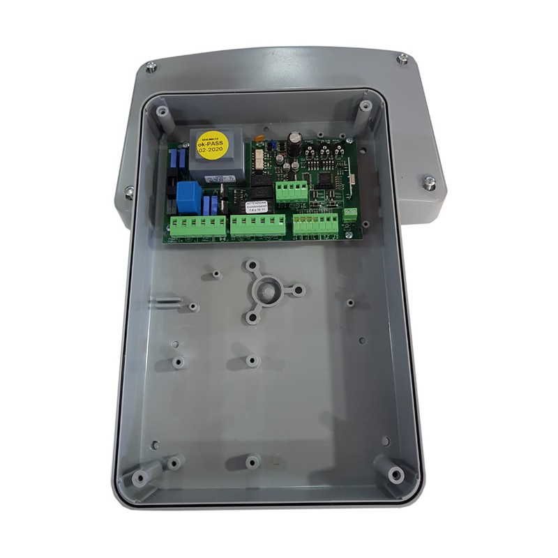 Cuadro de control modelo ELB 230M2 de la marca VDS. Alimentado a 230V. Para 2 motores de puertas BATIENTE u otras puertas con receptor de frecuencia 433.92 MHz. EVOLUTIVO universal tipo KEELOG para 256 códigos.