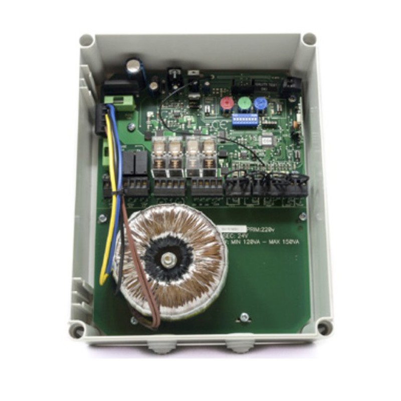Cuadro de maniobras con receptor integrado con función Rolling Code y código del interruptor seleccionable fijo.