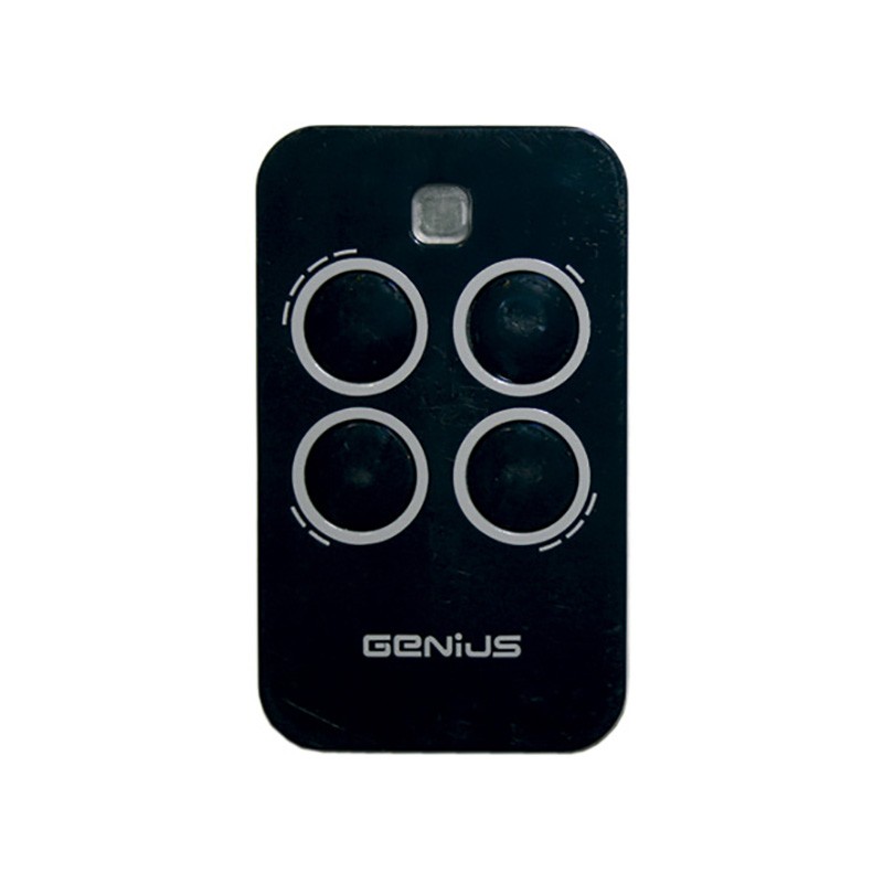 Mando de garaje marca GENIUS, modelo ECHO TX4 de 4 botones color negro. La frecuencia de este mando a distancia es 433,92 MHz y la codificación se realiza por sistema de grabación en el receptor.