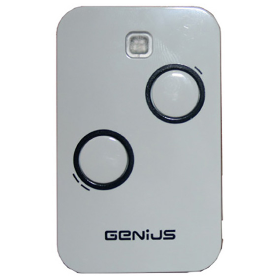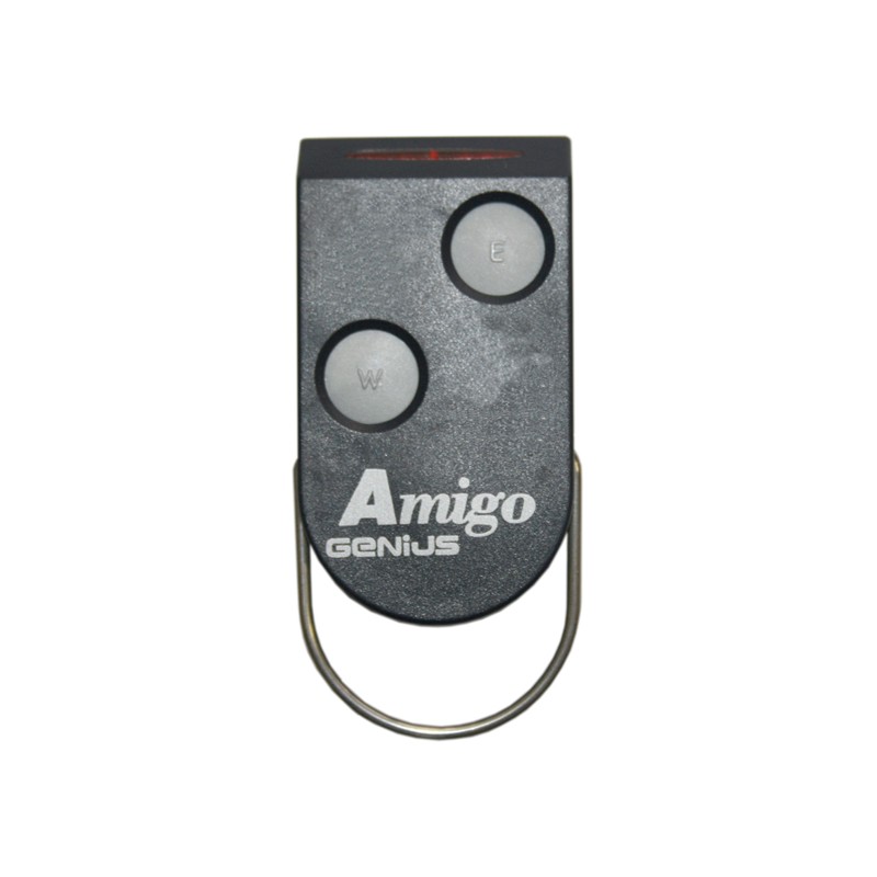 Mando de garaje marca GENIUS, modelo Amigo JA332 de 2 botones color gris. La frecuencia de este mando es 868,35 MHz y la codificación se realiza por sistema de grabación en el receptor.