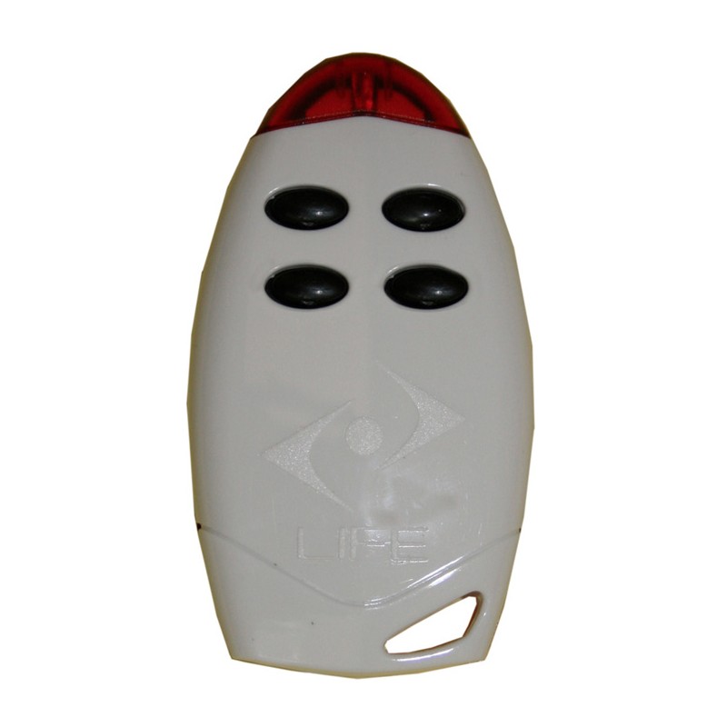 Mando de garaje marca LIFE, modelo VIP4R de 4 botones color gris. La frecuencia de este mando es 433,92 MHz y la codificación se realiza por sistema de grabación en el receptor.