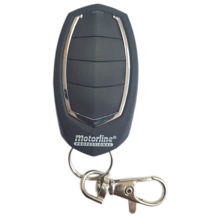 Mando de garaje marca MOTORLINE, modelo MX4SP RCM de 4 botones color negro. La frecuencia de este mando es 433,92 MHz y la codificación se realiza por sistema de grabación en el receptor.