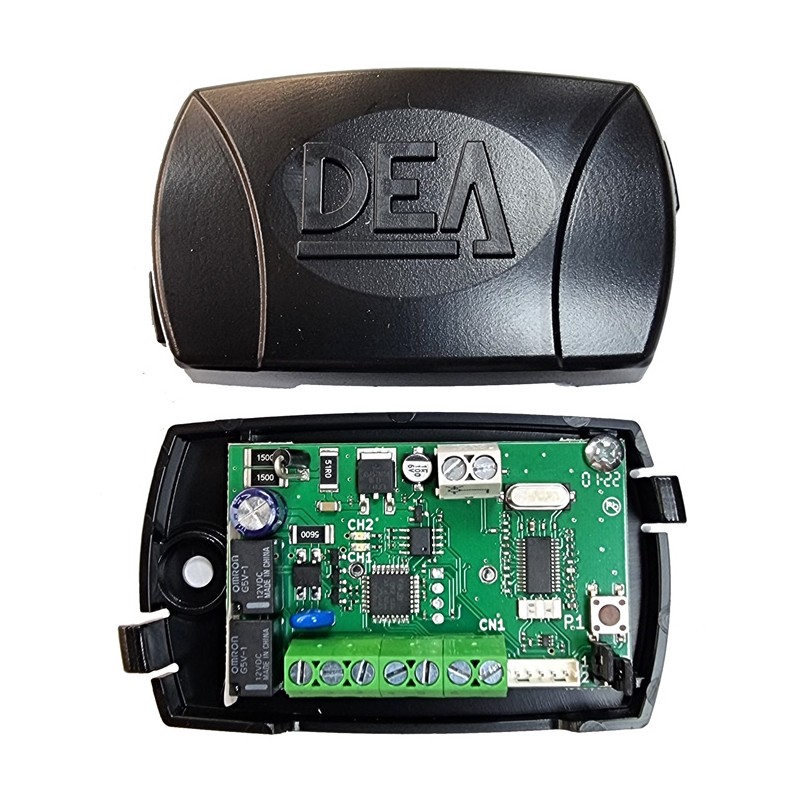 Receptor externo bicanal, 433MHz con capacidad para memorizar 1000 emisores y atribuir los botones de los mandos de forma independiente en cada emisor. Alimentación 24V AC/DC, potencia máxima absorbida 0,5A/30Vdc (para uso interno).