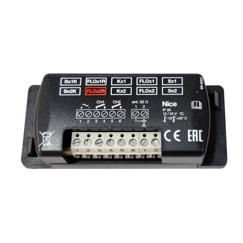 Receptor FLOX 2R de la marca NICE. Se alimenta a 12/24V.Frecuencia de trabajo 433.92 MHz. Código EVOLUTIVO con 63 códigos. Consta de 2 canales.