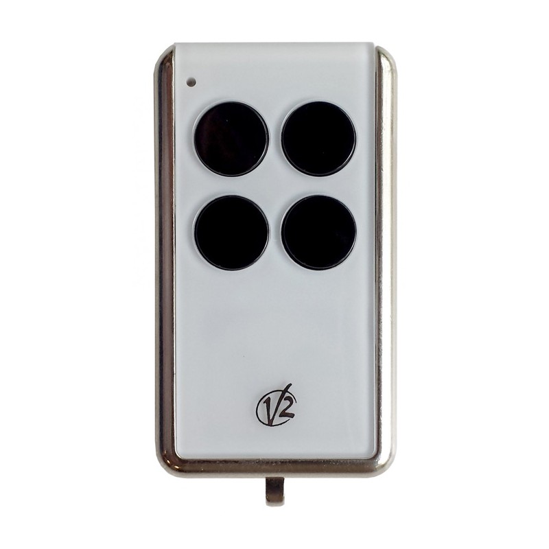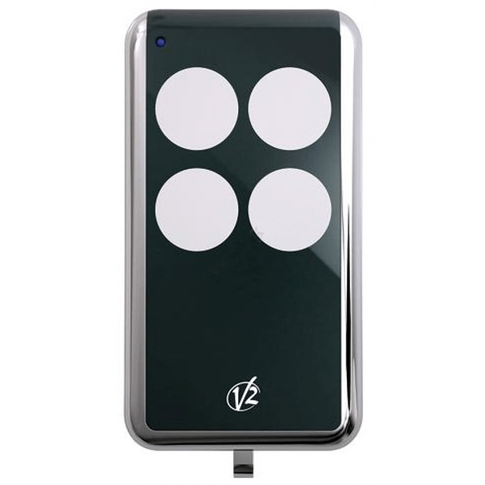 Mando de garaje marca V2, modelo MATCH-W de 4 botones color negro. La frecuencia de este mando es 433,92 MHz y la codificación se realiza por sistema de grabación en el receptor.